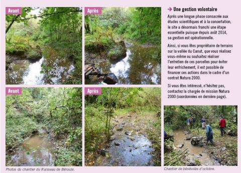 Voici l'exemple de la restauration du ruisseau de Bélouze, en aval de l'étang, réalisée en 2015.